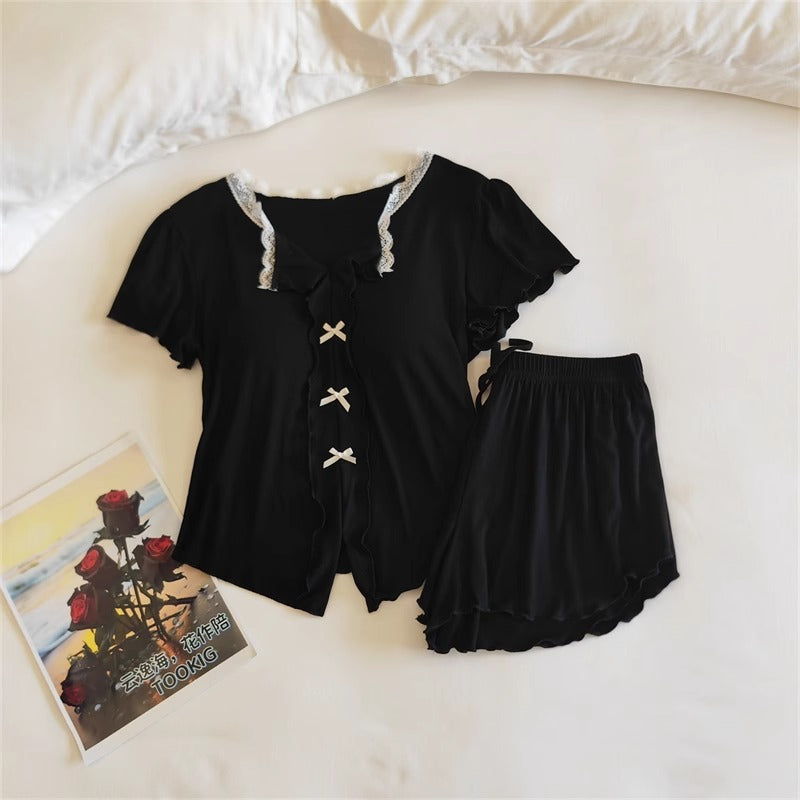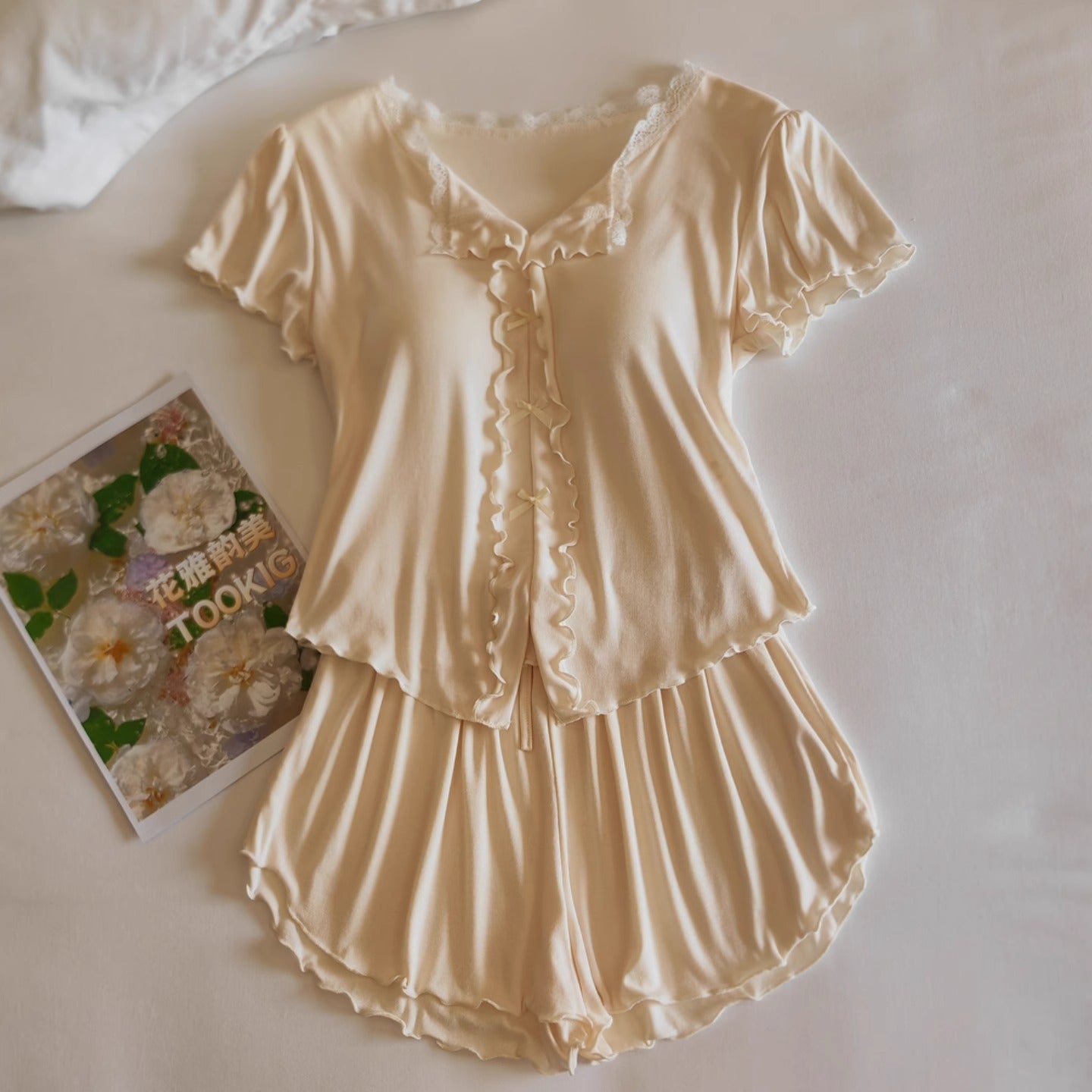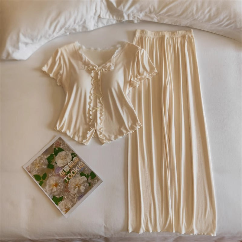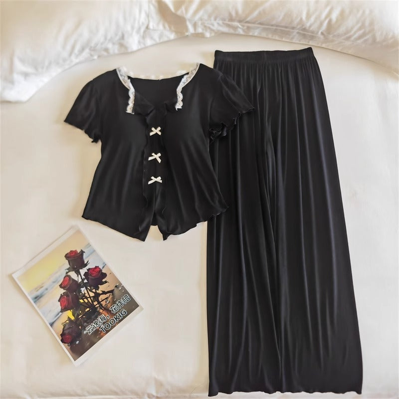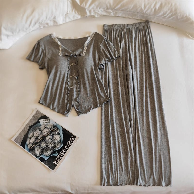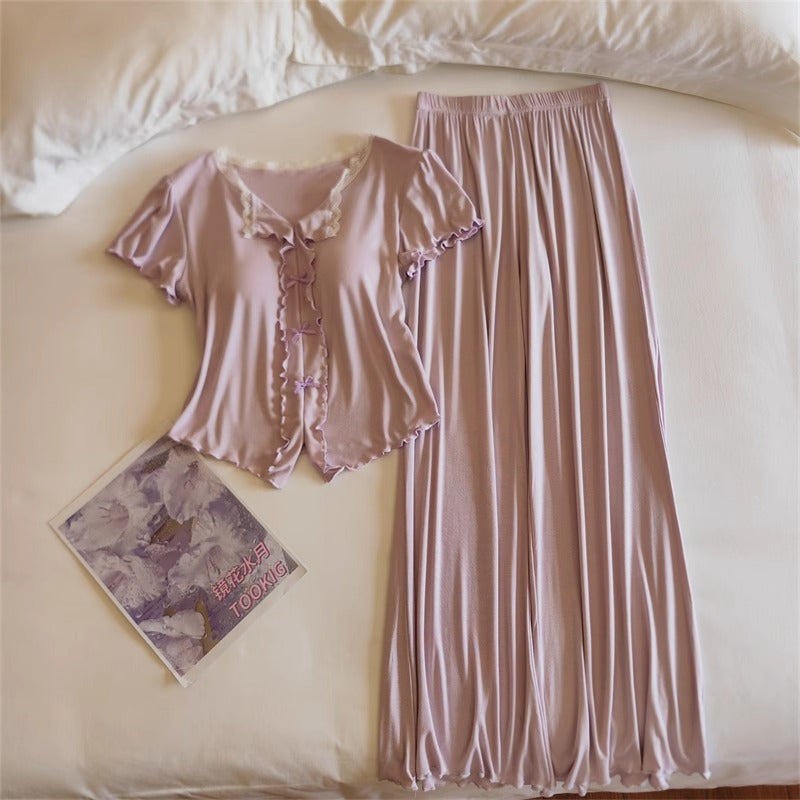 Two-Piece Set: Includes a short-sleeve top and long pants/shorts for versatile home wear.